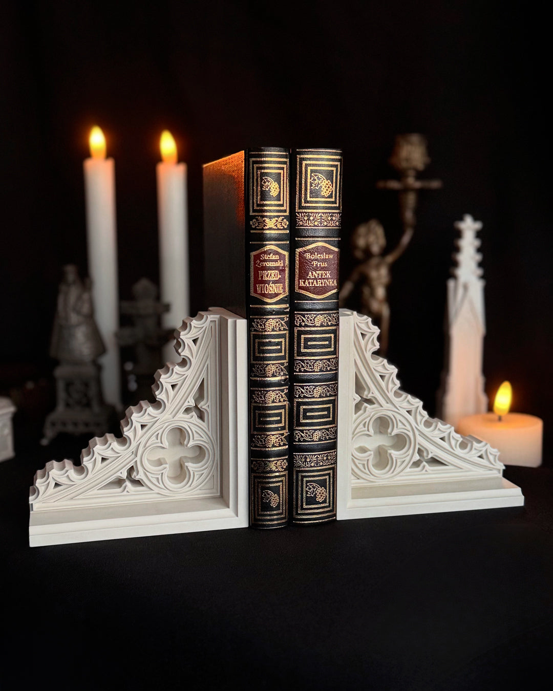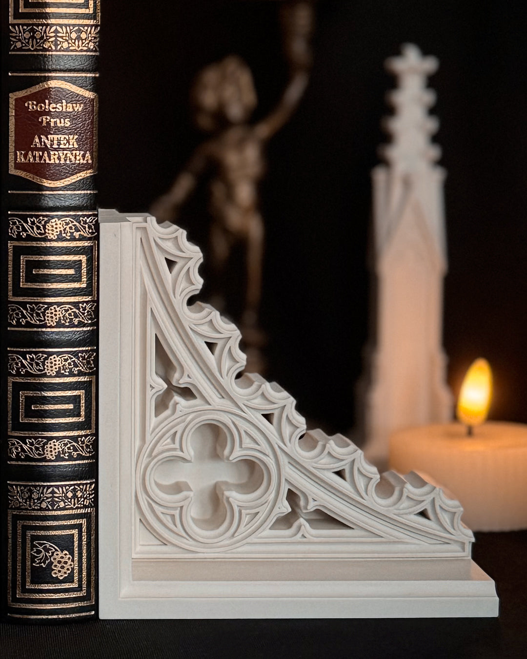 Wykonane z trwałych materiałów, te gotyckie podpórki do książek doskonale sprawdzą się we wnętrzach w stylu dark academia, klasycznych aranżacjach antycznych oraz wśród miłośników gotyckiego wystroju.